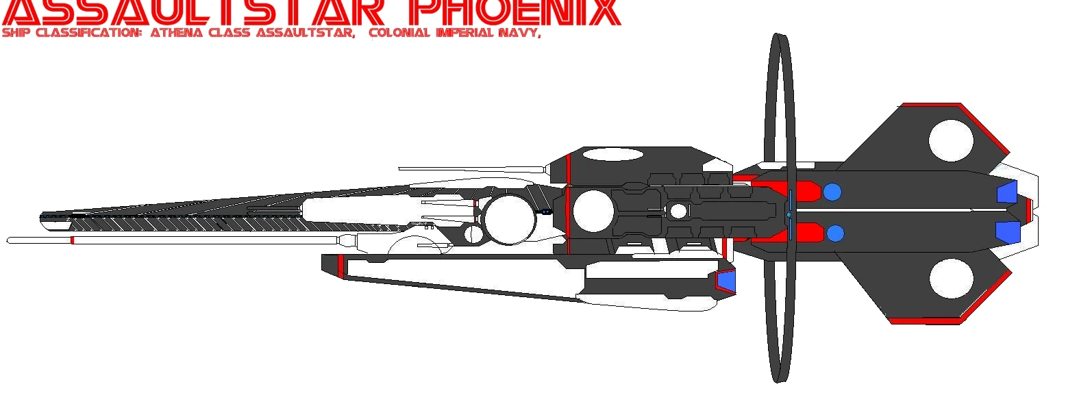 The IWS Phoenix is the Command Ship of the Athena Long Range Defense Fleet. Its main purpose is to Coordinate all of the other fleets ships and Fighters in order to maximize combat effencency. The Phoenix as all Imperial Command Warstars are surrounded by at least a minimum of 4 Imperial Allied Cylon BaseStars also known as Warstars. The other ships of the Athena Line are.